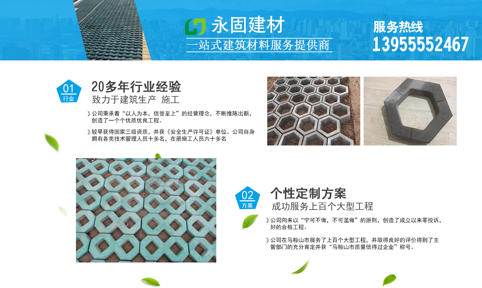 馬鞍山市永固建材有限公司,成立于一九九六年六月。公司秉承著“以人為本,信譽(yù)至上”的經(jīng)營(yíng)理念,不斷推陳出新,創(chuàng)造了一個(gè)個(gè)優(yōu)良工程。較早獲得國(guó)家三級(jí)資質(zhì),并獲《安全生產(chǎn)許可證》單位。公司自身?yè)碛懈黝?lèi)技術(shù)管理人員十多名,在冊(cè)施工人員六十多名,公司向來(lái)以“寧可不做,不可濫做”的原則,創(chuàng)造了成立以來(lái)零投訴,好的合格工程。得到了主管部門(mén)的充分肯定并獲“馬鞍山市質(zhì)量信得過(guò)企業(yè)”稱(chēng)號(hào)。我們從戰(zhàn)略高度審視市場(chǎng),創(chuàng)造性開(kāi)展各項(xiàng)工作,在建筑裝飾行業(yè)中,力爭(zhēng)做到人無(wú)我有,人有我精,在保證硬件實(shí)施的同時(shí),注重軟件環(huán)境的建設(shè),按現(xiàn)代企業(yè)制度的要求,樹(shù)立誠(chéng)信的企業(yè)理念,推進(jìn)企業(yè)的管理向系統(tǒng)化、正規(guī)化、制度化邁進(jìn);為創(chuàng)造好的企業(yè)、優(yōu)異的效益、好的管理打下堅(jiān)實(shí)的基礎(chǔ)。我們把企業(yè)的發(fā)展、回報(bào)客戶(hù)和社會(huì)當(dāng)做首要?jiǎng)?wù),我們追求優(yōu)良品質(zhì),將以至誠(chéng)至美的團(tuán)隊(duì)協(xié)作精神誠(chéng)信服務(wù),竭誠(chéng)為廣大客戶(hù)提供完善的服務(wù)。